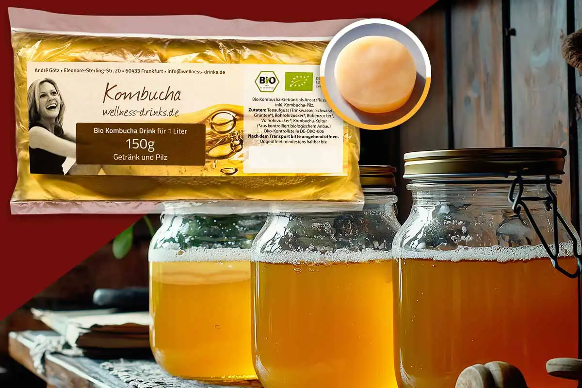 Kombucha-Herstellung: Enthält einen aktiven Kombucha-Pilz (Ø ca. 7 cm) und fertigen Bio-Kombucha